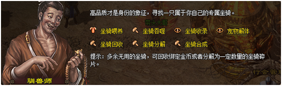1、 坐骑喂养,给坐骑食用道具,可提升坐骑的成长等级,等级越高,可领悟的属性就越好