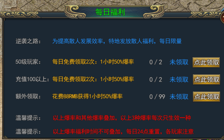 每日福利功能里的三种功能,只能升效一种,并且不能叠加生效,当时间过期后方可到此NPC处重新开启爆率