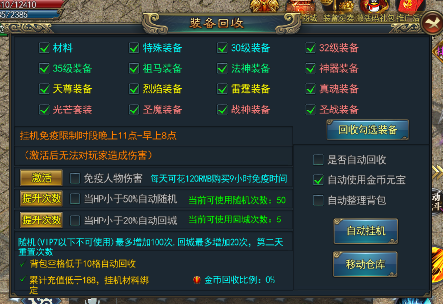 功能中的自动随机功能需要升级到VIP7才能正常使用,自动回城的功能没有任何限制,材料解绑需要累计充值188